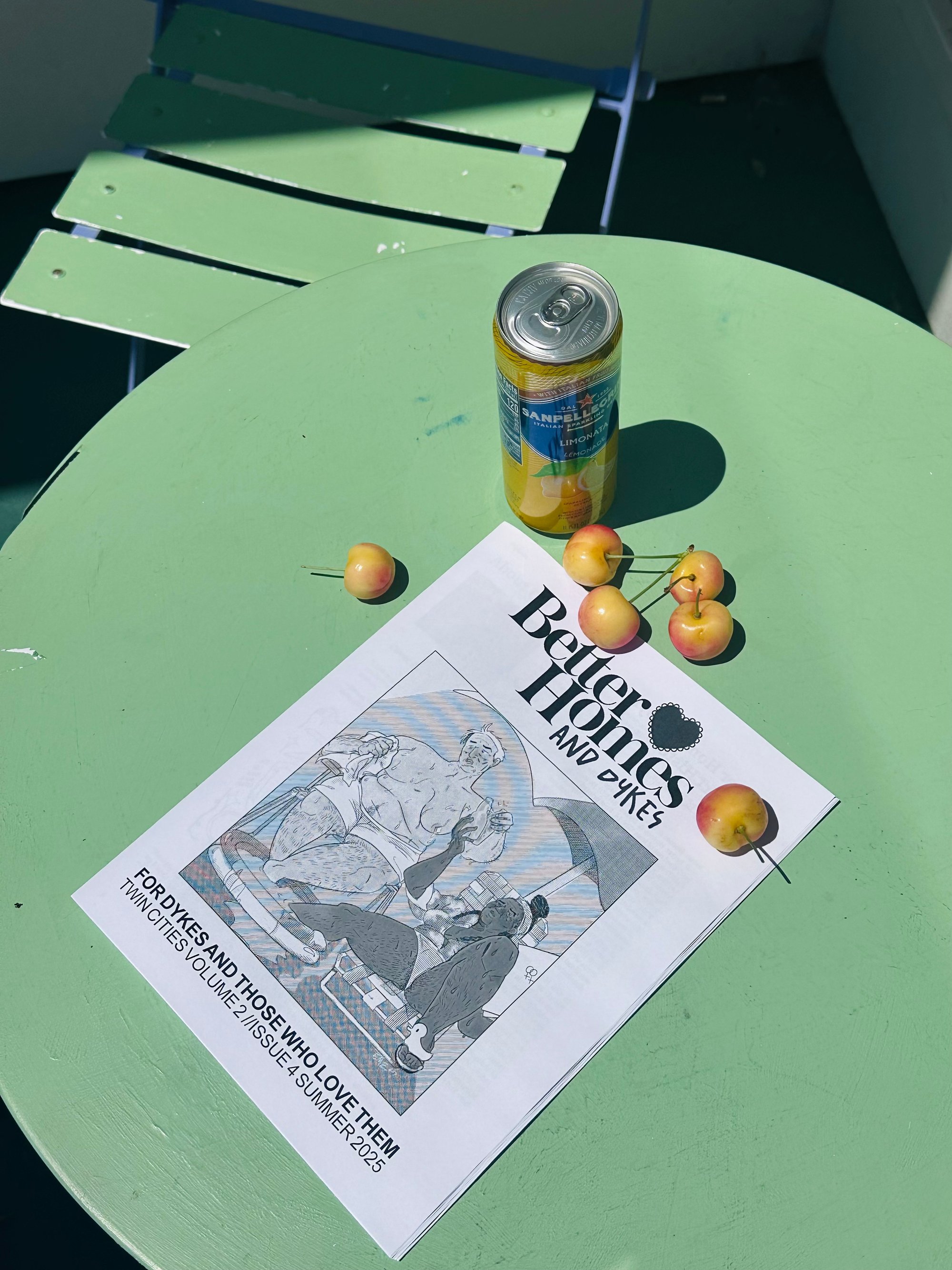 • One copy of Better Homes and Dykes’ SUMMER 2025 Issue • 8.5×11″ printed in B&W. • Cover Artist: Emma "EMZ" Ozark (zir/hir/she/her) // insta @emzarkArt • Sliding scale pricing, $10-$20